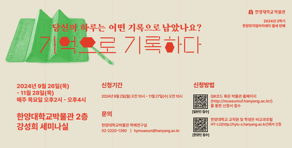 담당 부서 : 박물관 행정팀 게시 기간 : 2024.09.02 ~ 2024.09.15 미디어보드 newsh@hanyang.ac.kr 다른기사 보기 저작권자 © 뉴스H 무단전재 및 재배포 금지 당신만 안 본 뉴스 [포토스토리] "AI 시대 해답은 브랜딩", 오세훈 서울시장의 경영학 특강 현장 Into the Creation 2025, 창작자들의 꿈에 날개를 이찬규 학생, 사이버·우주 융합연구로 2025 사이버안보논문공모전 대상 수상 한양대, '2026 QS 지속가능성 순위' 세계 161위, 국내 4위 기록 해커톤에서 인턴십까지, 현대차 사내 스타트업에 다녀오다 [창업지원단 인턴십 경험기] [포토스토리] 한양 속에 사회혁신을 품다, SSIR 먼슬리 콜로키움 현장 행복은 좋은 경험의 ‘빈도’에서, 서은국 교수와 함께한 한양인의 힐링콘서트 현장 2025 중앙일보 대학평가 서울 3위, ERICA 13위 댓글삭제 삭제한 댓글은 다시 복구할 수 없습니다. 그래도 삭제하시겠습니까? 비밀번호 닫기 기사 댓글 0 댓글 접기 로그인 후 이용 가능합니다. 댓글 내용입력 비회원 로그인 이름 비밀번호 댓글 내용입력 댓글쓰기 계정을 선택하시면 로그인·계정인증을 통해 댓글을 남기실 수 있습니다. 회원 로그인 비회원 글쓰기 이름 비밀번호 자동등록방지 로그인 옵션 창닫기 기획기사 [포토스토리] "AI 시대 해답은 브랜딩", 오세훈 서울시장의 경영학 특강 현장 Into the Creation 2025, 창작자들의 꿈에 날개를 해커톤에서 인턴십까지, 현대차 사내 스타트업에 다녀오다 [창업지원단 인턴십 경험기] [포토스토리] 한양 속에 사회혁신을 품다, SSIR 먼슬리 콜로키움 현장 행복은 좋은 경험의 ‘빈도’에서, 서은국 교수와 함께한 한양인의 힐링콘서트 현장 [카드뉴스] '한양대학교 SDGs? 알고 보니 내 일상 속에 있었다!' 1편