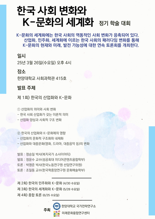 행사는 2025년 3월부터 6월까지 매월 마지막 주 수요일 오후 4시, 한양대학교 사회과학관 415호에서 총 4차례에 걸쳐 연속 토론회 형식으로 진행된다. 각 회차는 한국 사회의 변화 과정을 중심으로 K-문화의 형성과 발전을 주제로 구성되며, 다양한 분야의 전문가들이 참여해 심도 있는 논의를 이어갈 예정이다.