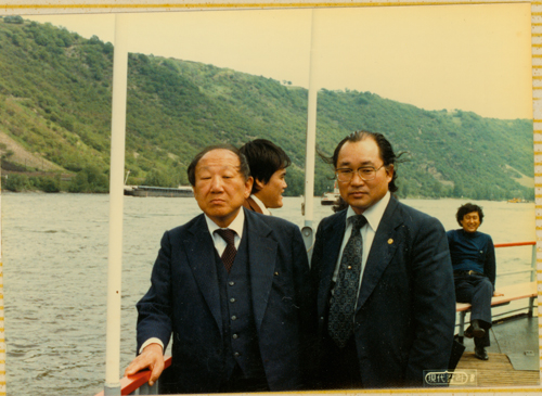 | ▲ 1979. 5. 26 해외출장(독일) 당시 라인강변에서 故김연준 총장과 오진환 교수가 기념사진 촬영을 하고 있다. | ||
