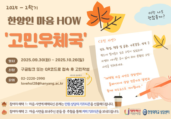 한양대 서울캠퍼스 상담센터가 2학기를 맞아 '한양인 마음 HOW 고민우체국'을 운영한다. 이는 진로, 학업, 생활습관, 가족관계, 성격 등 다양한 고민을 가진 한양인들이 스트레스를 공유하며 치유할 수 있도록 마련됐다.