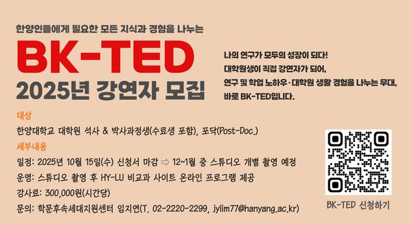 한양대 학문후속세대지원센터가 'BK-TED 2025 강연'에 참여할 대학원생 강연자를 모집한다. 이번 프로그램은 대학원생이 직접 연구와 학업, 대학원 생활 노하우를 나누는 무대로, 한양인들이 필요로 하는 실질적인 지식과 경험을 공유하는 것을 목표로 한다.