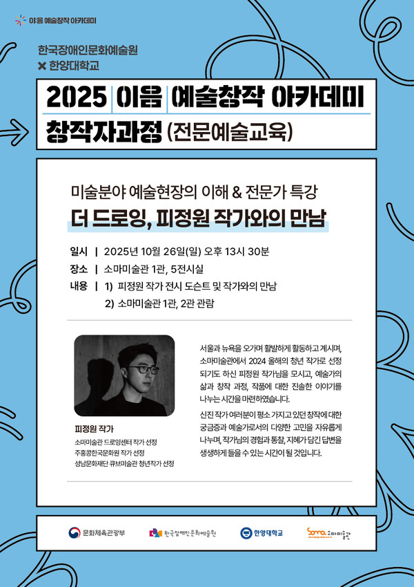 한양대학교 한양미술+디자인교육센터(Head Lab)는 한국장애인문화예술원과 함께 운영하는 ‘2025 이음 예술창작 아카데미 창작자과정(전문예술교육)’의 일환으로 오는 10월 26일 신진 장애예술인을 대상으로 ‘예술현장의 이해’ 프로그램을 진행한다고 밝혔다. 이번 프로그램은 예술 현장에 대한 직접적 경험과 교류를 통해 참여자들이 전문 예술가로 성장할 수 있도록 돕기 위한 취지로 마련됐다.