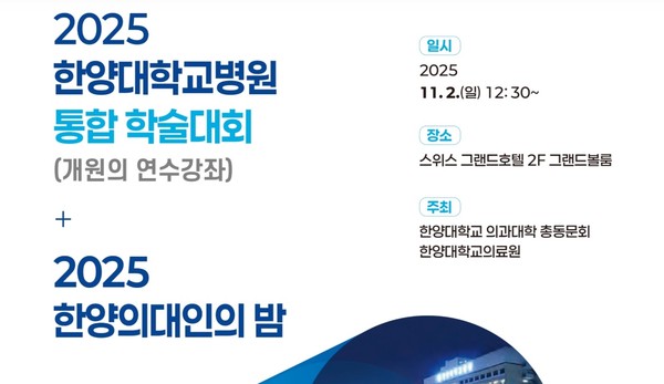 한양대병원이 한양대 의과대학 총동문회와 공동으로 '2025 한양대병원 통합 학술대회 및 한양의대인의 밤'을 개최한다. 오는 11월 2일, 스위스 그랜드호텔 2층 그랜드볼룸에서 진행될 예정이다. '진료현장 중심의 실질적 지견 공유와 교류의 장'을 목표로 한 이번 행사에서는 현장 임상 상황과 최신 치료 지견, 실제 적용 사례를 심도있게 다룬다.