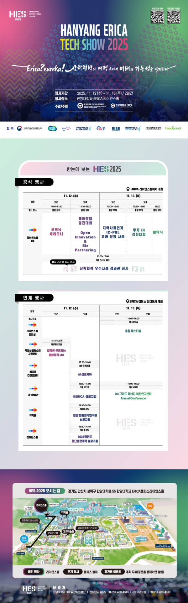 한양대 ERICA캠퍼스가 오는 11월 12일부터 13일까지 이틀간 'HANYANG ERICA TECH SHOW 2025(HES 2025)'를 개최한다. 이번 행사는 대학의 연구 및 산학협력 성과를 공유하고 새로운 협력 기회를 발굴하기 위한 자리로, 라이언스홀을 중심으로 캠퍼스 전역에서 진행된다.