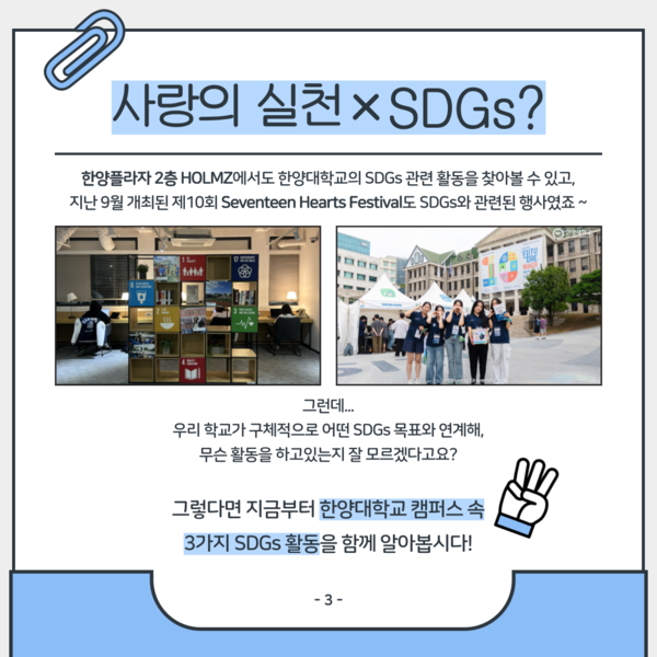 그렇다면 지금부터 한양대학교 캠퍼스 속 3가지 SDGs 활동을 함께 알아봅시다!