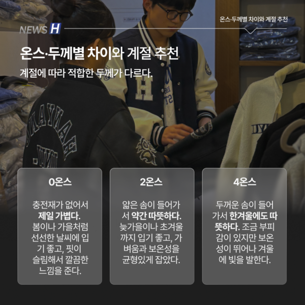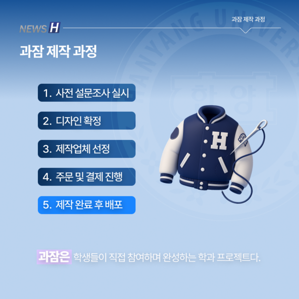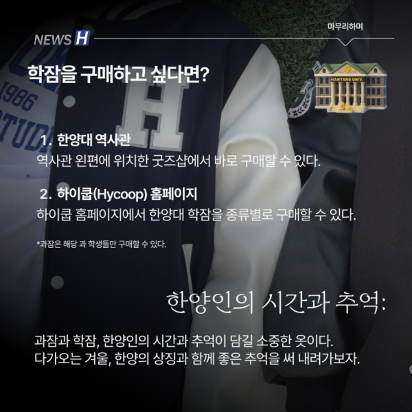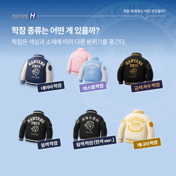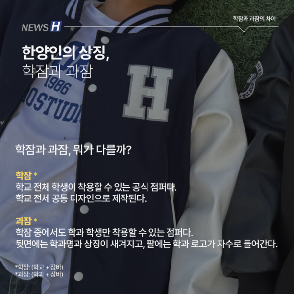 한양대 학생들에게 '학잠'과 '과잠'은 정체성을 나타내는 아이템이다. 학과별로 디자인이 제각각인 만큼 때로는 개성을 뽐내는 수단이 되기도 한다. 뉴스H가 학잠과 과잠의 차이부터 안감에 따른 두께와 계절별 추천, 제작 과정과 구매처 정보까지 카드뉴스에 담았다. 한양인의 상징, 학잠과 과잠의 모든 것을 함께 파헤쳐보자.