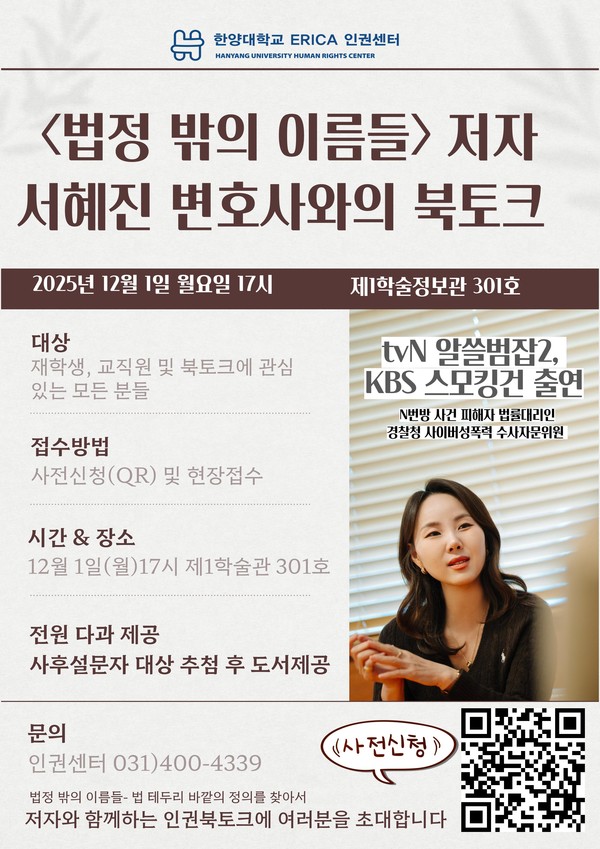 한양대 ERICA 인권센터가 오는 12월 1일, 인권도서 『법정 밖의 이름들: 법 테두리 바깥의 정의를 찾아서』의 저자 서혜진 변호사를 초청해 북토크를 개최한다.