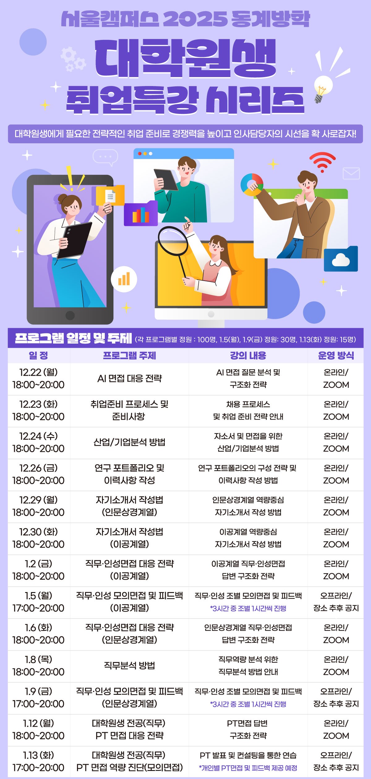 한양대학교 서울캠퍼스 커리어개발팀이 오는 12월 22일(월)부터 '2025 동계방학 대학원생 취업특강 시리즈' 참가자를 모집한다. 이번 프로그램은 저학년 대학원생의 취업전략 계획부터 졸업을 앞둔 대학원생의 취업 준비까지 돕는 것을 목적으로 한다. 대학원생에 특화된 계열별 자기소개서 작성법 및 산업/기업/직무 분석 방법, 면접 대응전략과 실제 모의면접 및 피드백까지 받을 수 있는 기회인 만큼 취업을 목표로 하는 많은 대학원생들의 참여가 기대된다.