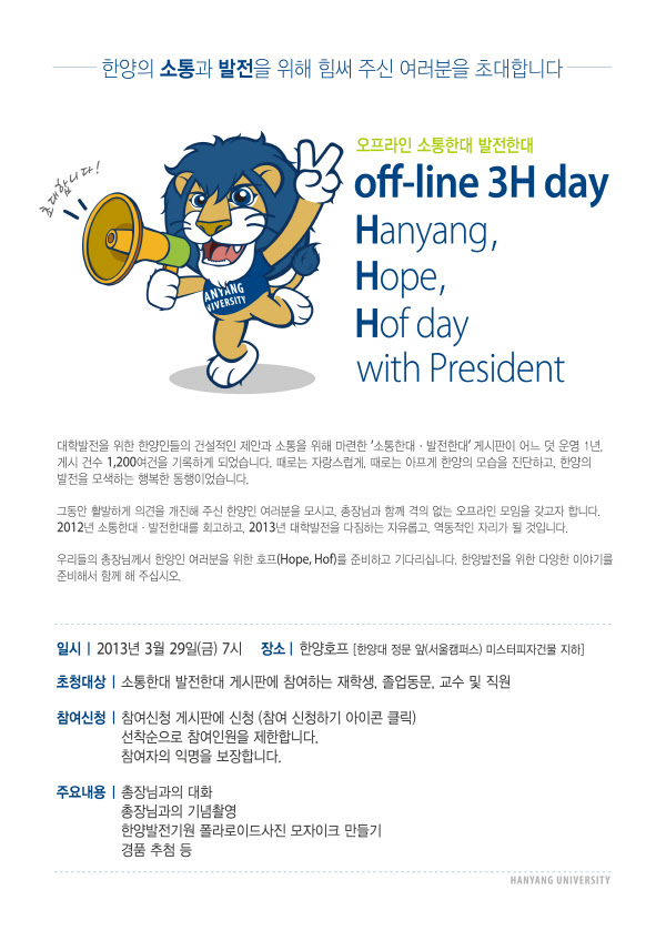 한양대학교는 학생들과의 소통을 강화하고자 총장이 직접 학생들을 만나는 'Hanyang, Hope, Hof day with President' 행사를 29일 대학 근처 호프집에서 개최한다고 밝혔다. 대학 구성원들의 다양하고 건설적인 제안을 받아 실행에 옮기고, 이를 대학 발전으로 연계시키기 위해 약 1년전에 개설한 대학 홈페이지 내 게시판이 동기가 된 행사다. 그 동안 온라인에서 활발하게 진행되었던 교감을 오프라인에서도 확장해 보겠다는 취지로, 행사 타이틀도 '오프라인 소통한대 발전한대'로 정해졌다.