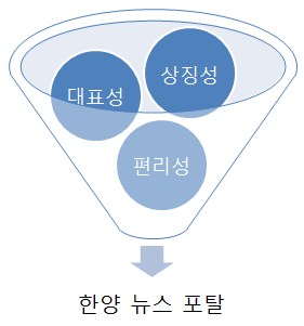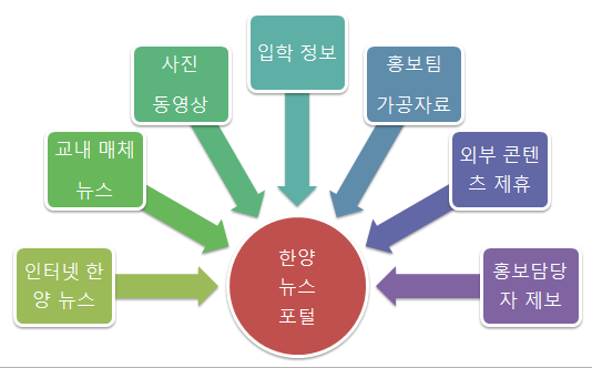 한양뉴스포털을 기획한 대학 홍보팀에서 말하는 온라인 홍보 전략의 키워드는 다음 세가지다. 소셜 네트워크, 큐레이션, 언론사형 시스템이다. 이 3가지를 전개해 나가기 위해서는 기본이 되는 '콘텐츠'가 필요하고, 그것들을 모아 놓을 큰 그릇이 필수적이다. 그 그릇이 바로 '뉴스 홈페이지'이다. 이 뉴스 사이트에서는 한양대 내에서 발생하는 모든 이슈들이 기사로 만들어져서 마치 언론사에서 기사가 올라오는 것과 동일한 절차를 거치게 된다. 거기에 홍보팀만의 요약과 정리가 가미되어 중요한 뉴스를 꼭 찝어주게 된다. 이것이 큐레이션이다. 아무리 좋은 뉴스도 알려지지 않으면 생명이 없는 법. 요즘 유행하는 소셜 네트워크 서비스(SNS)들을 타고 확산을 시키는 것이 포인트다.