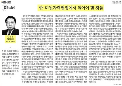 김경민 한양대 사회과학부 정치외교학과 교수는 4월 1일자 <서울신문>에 1년 앞으로 다가운 한·미 원자력 협정 개정과 관련한 기고문을 썼습니다. 기고문에서 김 교수는 미국이 현재 규제하고 있는 '우라늄 농축 금지'와 '사용후 핵연료 재처리 금지'에 대한 해결이 필요하다고 언급합니다.