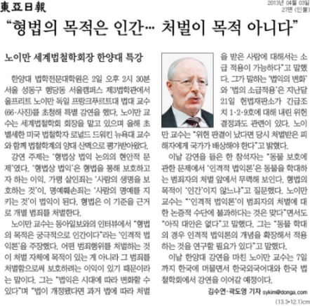 4월 3일자 <동아일보> 인물면에 울프리드 노이만 독일 프랑크푸르트대 법대 교수의 한양대 방문 그리고 특강얘기를 들을수 있다. 노이만 교수는 세계법철학회장을 맡고 있으며, 동아일보와 인터뷰를 통해 지난달 21일 우리 헌법재판소가 긴급조치 1,2,9호에 대해 내린 위헌결정에 대해서도 의견을 피력했다.