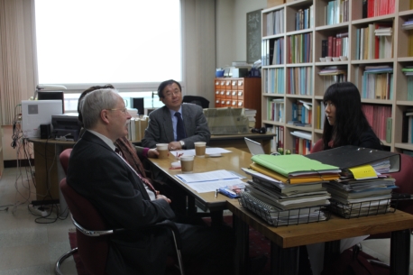 | ▲ 4월 2일 특강에 앞서 동아일보 기자와 인터뷰 하고 있는 노이만 교수 | ||