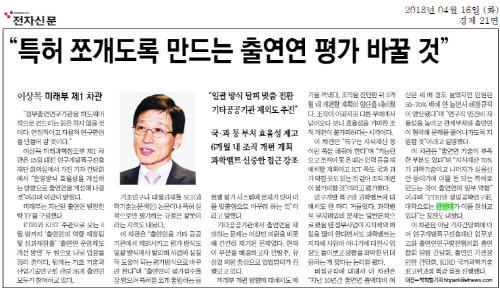 4월 16일 <전자신문>에는 15일 대전 연구개발특구진흥재단 회의실에서 있었던 이상목 미래과학창조부 제1 차관 기자 간담회 내용이 기사로 게재되었습니다. 주로 미래부에서 구성하는 정부출연연구기관에 대한 발전 전략을 설명하는 자리였는데요. 여러 내용중에 출연연의 한계를 보완해주는 일부 기관의 사례를 설명하면서 대학중에는 '한양대'가 잘하고 있다고 칭찬한 것으로 알려졌습니다. 기사에는 아래와 같이 인용이 되었습니다.