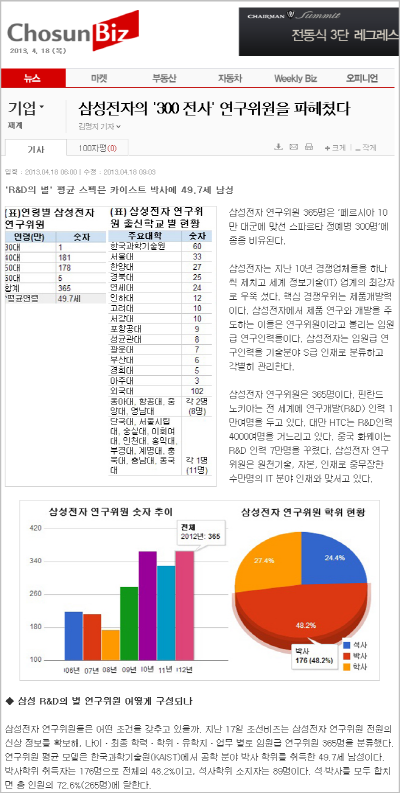 4월 17일자 조선비즈에는 삼성전자 핵심 연구를 담당하고 있는 연구위원 365명의 정보를 분석한 기사가 게재되었습니다.