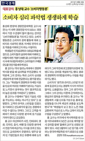'소비자행동론'을 가르치고 있는 홍성태 경영대학 경영학부 교수의 인터뷰 기사가 4월 22일자 <한국경제>에 실렸습니다. 경영전문석사(MBA) 과정에서 가장 많은 수강생이 몰리는 이 강의는 인지심리학과 사회심리학을 바탕으로 소비자의 심리를 이해하고 구매를 유도하는 방법을 가르칩니다. 홍 교수는 인터뷰에서 시장 경쟁에서 이기기 위해서는 고객의 라이프 스타일을 이해하고, 다양한 분야에 호기심을 가지는 것이 무엇보다 중요하다고 말합니다.