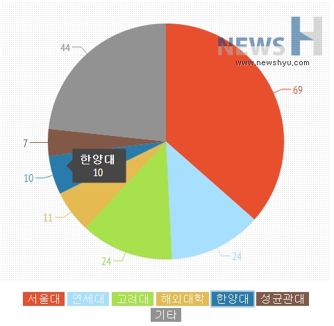 출신대학별로 보면 서울대가 69명(36.5%), 고려대와 연세대가 각각 24명, 해외대학 11명, 한양대 10명, 성균관대 7명, 부산대 6명 순이었다. 한양대의 경우 국내 대학 중에는 4번째로 많은 수를 배출한다고 할 수 있다.