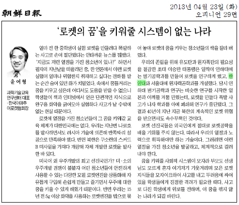 23일 <조선일보> 사설중에 우리나라의 열악한 로켓 개발 지원에 대한 내용으로 윤여형 과학기술교육연구센터 대표·한국아마추어로켓협회장이 쓴 글이 있습니다. 역사적인 배경으로서 초대 이승만 대통령 시절 한양대에 원자력공학과가 개설된 내용을 말씀하시네요. 아래는 해당 부분입니다.