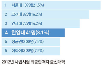 법무부가 지난해 11월 21일 발표한 사법시험 최종합격자 출신대학 현황에 따르면 전체합격자 506명 중 우리 대학 출신은 41명으로 4위를 차지했다. 합격자 비율은 8.1%로 전년대비 1.7% 상승했다.