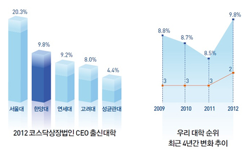 8월 8일 코스닥협회가 발간한 <2012 코스닥상장법인 경영인명록>에 따르면 올해 7월 1일 기준으로 1,013개사 코스닥상장법인 CEO 1,221명의 출신대학 조사에서 우리 대학이 9.8%로 서울대에 이어 두 번째로 높은 비중을 차지했다. 이어 연세대(9.2%), 고려대(8.0%), 성균관대(4.4%) 순이었다.