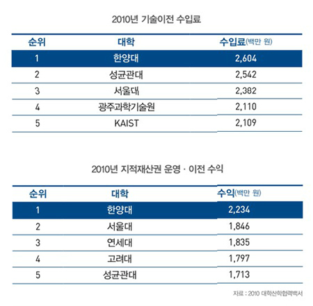 우리 대학의 산학협력 기술이전 수입이 국내 대학 중 가장 많은 것으로 나타났다. 교육과학기술부와 한국연구재단은 전국의 153개 산학협력활동 집중관리대학(이공계 학과가 설치된 대학)의 2010년 성과를 1년 동안 집대성해 4월 6일, ‘2010 대학산학협력백서’를 발표했다. 이 백서에 따르면 우리 대학의 기술이전 수입은 26억 400만 원으로 1위, 지적재산권 운영 및 이전 수입 또한 22억 3,400만 원으로 1위, 설비자산 사용료 수입은 9억 2,000만 원으로 4위를 차지했다. 기술이전 건수는 40건으로 7위를 차지했으나 기술이전 수입은 가장 많다는 점이 눈길을 끄는데 이러한 결과를 통해 우리 대학이 실용화 가능성 및 시장 경쟁력이 높은 기술을 연구, 개발하고 있음을 알 수 있다. 또한 연구비에 투자한 금액에 대비한 실적을 나타내는 연구비 회수율 항목에서는 1.615%로 기술이전 수입료 순위 15위 내 대학 중 4위를 차지했으며 과학기술 분야 전임교원 1인당 기술이전 수입료 항목에서는 320여만 원으로 6위를 기록했다.