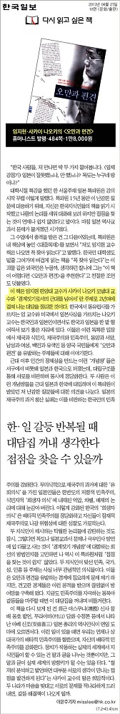 임지현 한양대 인문과학대학 사학과 교수가 사카이 나오키 코넬대 교수와 나눈 대담을 정리한 책 '오만과 편견'이 4월 27일자 <한국일보>의 '다시 읽고 싶은 책' 코너에 소개됐습니다. 도서는 두 교수가 '경계짓기로서의 근대를 넘어서'란 주제로 2년여에 걸쳐 나눈 대담을 정리한 책으로, 한국과 일본 국민들이 '오만과 편견'을 가지고 있는 주제들에 대해 이야기하고 있습니다.