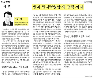 김종경 한양대학교 공과대학 원자력공학과 교수가 쓴 기고 '한미 원자력협상 새 전략 짜자'가 4월 30일자 <서울경제>에 실렸습니다. 김 교수는 기고에서 원자력협정을 바라보는 우리나라와 미국의 시각 차를 설명하고, 2년 연장된 시간동안 정부뿐만 아니라 국내 원자력계도 적극적으로 격차를 줄이기 위해 노력해야 한다고 강조합니다.