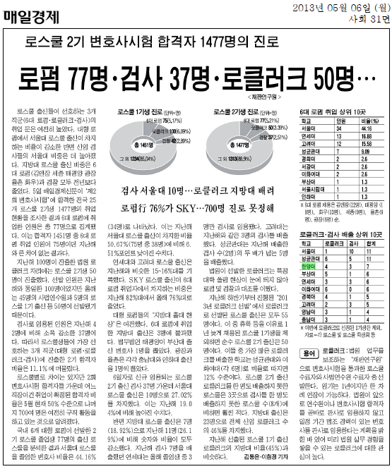 5월 6일 <매일경제> 기사에서는 위 3개 직군에 진출한 2기 합격자가 37명으로 11.1%의 비율이라고 분석했습니다. 대형 로폼의 경우 특정대학 쏠림 현상이 매우 심한 반면, 로클러크는 편중 현상이 나타나지 않았습니다.