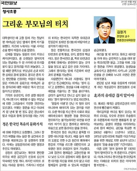 김정기 한양대학교 언론정보대학 신문방송학과 교수가 쓴 기고 '그리운 부모님의 터치'가 5월 6일자 <국민일보>에 실렸습니다. 김 교수는 한국인의 정에 대한 자신의 경험과 감상을 들려줌과 동시에 개성공단 폐쇄 논의까지 오게 된 북한과의 관계 속 정에 대해서 언급하고 있습니다.