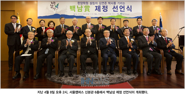 ‘나는 세계에서 으뜸가는 한양대학교를 이룩하려 했다. 건물, 학생, 교수, 그리고 각종 교육 시설의 완전 확충 속에서 아카데믹한 지성의 도장을 만들고자 하는 것이 나의 굳은 신념이었다.’ 1939년 한양의 역사를 시작한 故 백남 김연준 박사. 그는 ‘백남 사상 문집, 1년의 계획은 원단에 하라’에서 건립 정신을 위와 같이 밝혔다. 故 백남 김연준 박사 타계 후 5년이 지난 지금까지 한양은 사명실상부 국내 최고의 사학으로, 공학교육의 불모지였던 우리나라의 산업화를 이끈 견인차로, 사랑을 실천하는 인재를 양성하는 요람으로 성장했다. 지난 75년의 역사와 함께 한양학원 설립자 故 백남 김연준 박사의 뜻을 기리기 위한 백남상이 제정됐다.