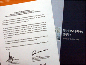 "싱가폴 건축대학과 우리학교의 공동강의 시스템은 이전에 실행되었던 국제화 프로그램이나 교환학생 프로그램과는 차원이 다릅니다. 과거 교수와 학생이 외국 학교에 가서 그 나라의 문화와 그 학교의 교육을 배워왔던 것은 위탁교육입니다. 그 안에서는 우리의 주체성을 찾아볼 수는 없었죠. 공동강의 시스템은 싱가폴과 함께 프로그램을 계발하고, 배우고, 교수와 학생을 상호 교류하는 것입니다. 우리의 주체성도, 싱가폴의 주체성도 모두 지닌 새로운 형태의 교육방식이 창조되는 것입니다."
