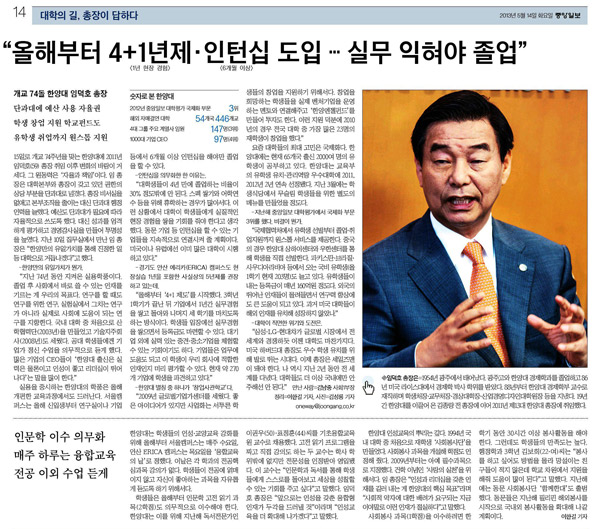 | ▲ 5월 14일자 <중앙일보> 14면에 게재된 한양대학교 임덕호 총장 인터뷰 | ||