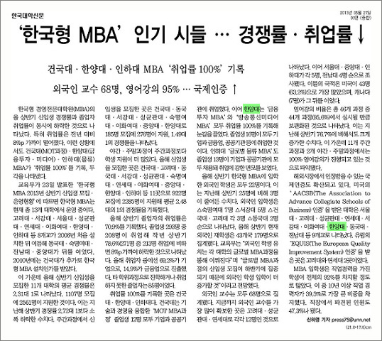 5월 28일자 <한국대학신문>에 한국형 경영전문대학원(MBA)의 상반기 신입생 경쟁률과 졸업자 취업률과 관련한 기사가 실렸습니다. 교육부가 23일 발표한 '한국형 MBA 2013년 상반기 신입생 모집 운영현황'에 따르면 11개 대학의 평균 경쟁률은 2.31대 1로 지난해 상반기 경쟁률 2.72대 1보다 소폭 하락했습니다. 올해 상반기 졸업자의 취업률은 70.9%를 기록하며 작년 상반기 78.6%대비 8%p가 하락한 것으로 나타났습니다.