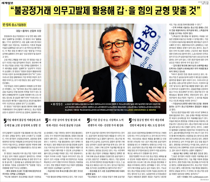 중소기업청장 취임 2개월을 앞둔 한정화 경영학부 교수의 인터뷰가 5월 21일 <세계일보>에 실렸습니다. 한양대 경영전문대학원장 겸 경영대학장인 한 교수는 "의무고발제를 활용해 대·중고기업간 힘의 균형을 맞추는 일에 나서겠다"고 중소기업청장으로서의 포부를 밝혔습니다.