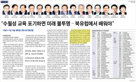 지난 29일 서울 소공로 더플라자호텔에서 '글로벌 인재포럼 2013'을 성공적으로 개최하기 위한 자문회의가 열렸습니다. 임덕호 한양대 총장은 글로벌 인재포럼 2013 자문위원 학계 분야 소속으로 자문회의에 참여했는데요. 임덕호 총장은 '한국 교육 모델을 더 알리자'라는 주제에 대해 선진국들의 개발도상국 시장 개척 현황을 설명하며 "우리 대학생이 제 3세계로 더 많이 나갈 수 있도록 대학과 기업이 힘을 합쳐야 한다"고 강조했습니다. 자문위원단은 이 밖에도 '청년실업'에 대한 문제점을 지적하고 '대학 지원'에 대한 정책을 제안했습니다.