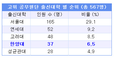 17개 부처 고위 공무원단 567명 중에서 수도권 대학 출신이 467명으로 82.4%였으며, 자세한 대학별 수치는 서울대 165명 (29.1%), 연세대 52명 (9.2%), 고려대 48명 (8.5%)에 이어 한양대 37명 (6.7%), 성균관대 28명 (4.9%) 순이다.