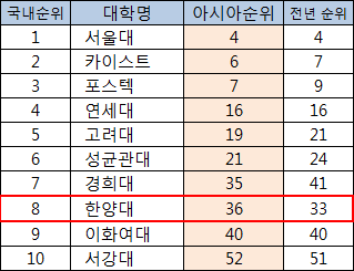 한양대는 아시아 36위로 전년대비 3계단 내려왔다. 이는 2011년 44위에서 11계단 상승했던 2012년 순위와 비교해도 안타까운 결과다.