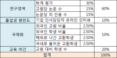 이 중 아시아대학 평가는 국내 언론사인 조선일보와 QS가 공동 발표하며 4개 영역 9개 지표를 통해 아시아 지역 대학들을 평가한다. 평가 지표는 학계 평가(30%)와 교원당 논문 수(15%), 논문당 피인용 수(15%)로 구성된 ▲연구 영역(비중 60%), ▲졸업생 평판도(10%), 외국인 교원 비율(2.5%), 외국인 학생 비율(2.5%), 해외로 나간 교환학생(2.5%), 국내에 들어온 교환학생(2.5%) 등 4개 지표로 구성된 ▲국제화(10%), 그리고 교원 대비 학생 수 비율을 산정한 ▲교육 여건(20%)으로 구성되어 있다. 특히 학계 평가나 졸업생 평판도는 전 세계 학자와 기업 인사 담당자들에게 이메일을 보내 온라인 인터뷰로 진행되기 때문에 객관적인 자료를 근거로 하는 지표와는 차별화 된다. | ||||||