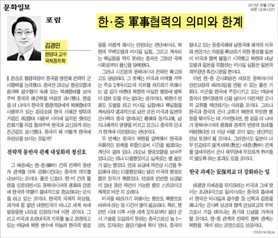 | ▲ 6월 7일자 <문화일보> 김경민 교수 '한·중 軍事협력의 의미와 한계' 기고 | ||