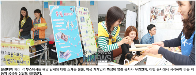 우리대학 사회봉사단 외 코이카, 해비타트, 안산자원봉사센터 등의 단체의 부스에서는 각 단체에 대한 소개 및 홍보 활동과 자원봉사자 모집이 이뤄졌다. 안산자원봉사센터 유다정 직원은 “대학생들이 자원봉사에 대해 어려워하는 감이 없지 않아 있다. 그런데 잘 생각해보면 요즘은 재능기부를 통한 봉사분야가 증가하고 있다”며 “전공도 다양해지고 있는 만큼 자신의 재능과 전공을 살려 봉사활동에 접목할 수 있는 것들을 많이 생각하길 바란다”고 봉사를 장려했다.
