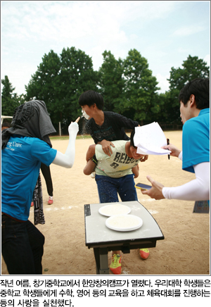 꼭 사회봉사교과목 수강을 통해서가 아니라도 한양인이 봉사할 수 있는 장은 마련돼 있다. 서울캠퍼스 ‘한양창의캠프’가 그것이다. 한양창의캠프는 학생들이 4박 5일간 지방에 있는 중학교에 방문하여 진행하는 교육봉사다. 한양창의캠프 봉사단으로 선발된 학생들은 수학, 과학, 미술, 영어, 체육 등의 과목에 창의적인 프로그램을 접목시켜 아이들의 흥미를 유발하고 각종 게임과 실험, 멘토링 등의 활동으로 사랑을 실천한다. 작년에는 태안에 위치한 창기중학교, 군산 소재의 동산중학교, 공주의 장기중학교, 김제의 중앙중학교에서 캠프가 진행됐다. 캠프에 참여했던 박준형 군(공과대·컴퓨터 2)은 사회봉사단 발간 잡지 ‘볼런티어’ 35호를 통해 “군입대를 앞두고 뜻 깊은 일을 한 것 같다”며 “준비기간까지 합쳐 2달이나 되는 시간 동안 그만두고 싶었던 적도 있었지만 캠프가 끝나고 나니 힘들었던 만큼 배운 것도 많았다. 마음이 따뜻했던 동산중학교 학생들을 만나서 행복했다”고 강조했다. 올해는 한양창의캠프 4개팀 85명이 선발되어 봉사활동을 계획하고 있다.