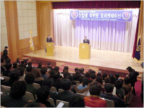 지난달 28일 서울캠퍼스 백남음악관에서는 '2003 신입생 학부모를 위한 오리엔테이션'이 열렸다. 학생생활상담연구소와 학생처 주관으로 열린 이번 행사는 오후 1시 반부터 4시간 여에 걸쳐 진행됐으며, '대학생 부모 역할, 이렇게 합시다'라는 주제로 강연과 개별 질의응답이 이어졌다. 올해로 3회째를 맡는 이번 행사는 예년과 다름없이 4백여 명의 학부모들이 참석, 자녀 지도에 관한 열띤 관심을 나타냈다.