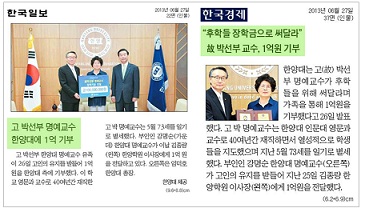 | ▲ 6월 27일 <한국일보>, <한국경제> 故 박선부 교수, 한양대에 1억원 기부 기사 | ||