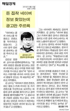 '네이버 광고'에 대한 문제 지적이 언론에 연일 보도되고 있는데요. 김인성 컴퓨터공학 교수는 <매일경제> 인터뷰를 통해 불법광고와 스팸 글로 얼룩져버린 네이버를 규탄했습니다. 김 교수는 네이버의 검색 결과와 상관없는 무분별한 광고 글과 다른 인터넷 사이트의 성장을 가로막는 폐쇄성을 비판했는데요. 김 교수는 문제를 해결하기 위해 정치권에서 '원본 우선법'과 '광고 제한법'을 제정해야 한다고 말했습니다.