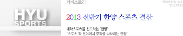 메이저리그 124승 신화 박찬호 동문(경영.92), 배구계 월드스타 김세진 동문(체육.92), 그라운드의 진공청소기 김남일 동문(체육.96), 현 국가대표농구팀 주장 양동근 동문(체육.00)까지. 대한민국 스포츠를 이끌어온 ‘한양의 스포츠인’들이다. 그리고 지금, 제2의 박찬호를 꿈꾸며 뜨거운 햇살 속에 땀방울 흘리는 이들이 있다. 바로 우리대학 ‘체육부’. 뛰어난 재능과 성실한 연습이 더해져, 2013년 상반기 한양 체육부는 각 분야에서 뛰어난 성과를 냈다. 2013 전반기, 경기장에 크게 울려 퍼지던 한양의 이름을 인터넷한양이 담아냈다.