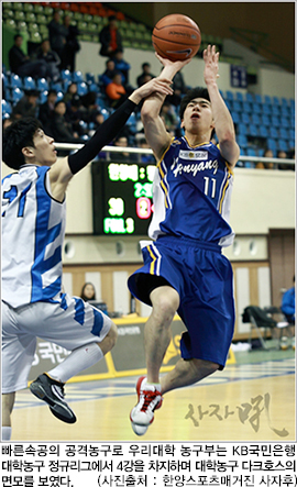2013년 상반기, 각종 전국대회에서 우리대학은 구기 종목에서 고른 활약을 보였다. 최근 다양한 이벤트로 많은 학생 관중들의 응원을 힘입은 농구의 경우, 상반기 열린 두 대회에서 모두 4강 이내의 성적을 기록했다. 특히 이번 상반기에는 2013 카잔 하계유니버시아드에서 태극마크를 달게 된 가드 이재도 선수(체대·스포츠산업 4)와 포워드 정효근 선수(체대·스포츠산업 2)의 두드러진 활약이 돋보였다. 올해 2월에 열린 MBC 대학농구대회에서 3위에 오른 우리대학 농구팀은 상반기 2013 KB국민은행 대학농구정규리그에서도 4강을 기록하며 대학농구 강자로서의 면모를 나타냈다. 전통적으로 빠른 속공을 강조하는 우리대학의 공격농구가 하반기에도 빛을 발할 것으로 기대된다.