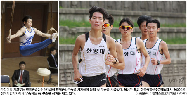 매년 항상 한, 두 차례 이상의 우승을 기록하는 체조부 역시 한양의 이름을 드높였다. 올해 첫 대회인 제68회 전국종별선수권대회에서 우리대학은 경희대를 제치고 단체종합 우승을 차지했다. 작년과 비교해 뛰어난 신입생들의 가세로 우리대학 체조부는 한층 더 강한 전력을 갖추게 됐다. 특히 뛰어난 유망주로 평가받는 박민수 군은 이번 대회에서 런던올림픽 도마부분 금메달리스트인 양학선 선수를 제치고 개인종합 1위에 오르는 성과를 보였다. 이 밖에도 육상부의 최준우 선수가 전국종별선수권대회에서 3000미터 장애물 달리기 우승, 대학선수권 대회에서 이상민 선수가 1500미터 달리기에서 우승을 하는 등 꾸준한 성과를 내고 있다.