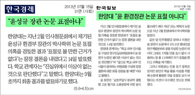 한양대는 윤성규 환경부 장관의 박사학위 표절 의혹을 검토한 결과 '근거가 없다'는 잠정 결론을 내렸습니다. 한양대는 학교 내부 인사들로 구성된 위원회에서 최종 검증을 할 예정이라고 밝혔습니다. 이 기사는 7월 15일 <한국경제>와 <한국일보>에 실렸습니다.