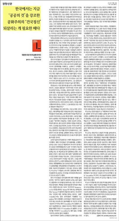 박찬승 한양대 사학과 교수가 펴낸 '대한민국은 민주공화국이다' 출간 기사가 7월 20일 <동아일보>, <경향신문>, <서울경제>와 22일 <한겨레>, <국민일보>에 실렸습니다. '대한민국은 민주공화국이다. 대한민국의 주권은 국민에게 있고, 모든 권력은 국민으로부터 나온다' 이는 헌법 제1조인데요. 박 교수가 펴낸 '대한민국은 민주공화국이다'는 헌법 제1조의 기원을 찾는 내용을 담고 있다고 합니다. 또한 '헌법 제1조'를 통해 한국 근현대사를 되돌아보고 그동안 잊혀졌던 민주공화국의 가치를 되새겨볼 수 있는 기회를 제공하고 있다고 하네요.