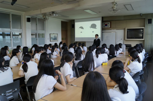 | ▲ 목포혜인여자고등학교에서 정윤화 대표가 강연을 하고 있다. | ||